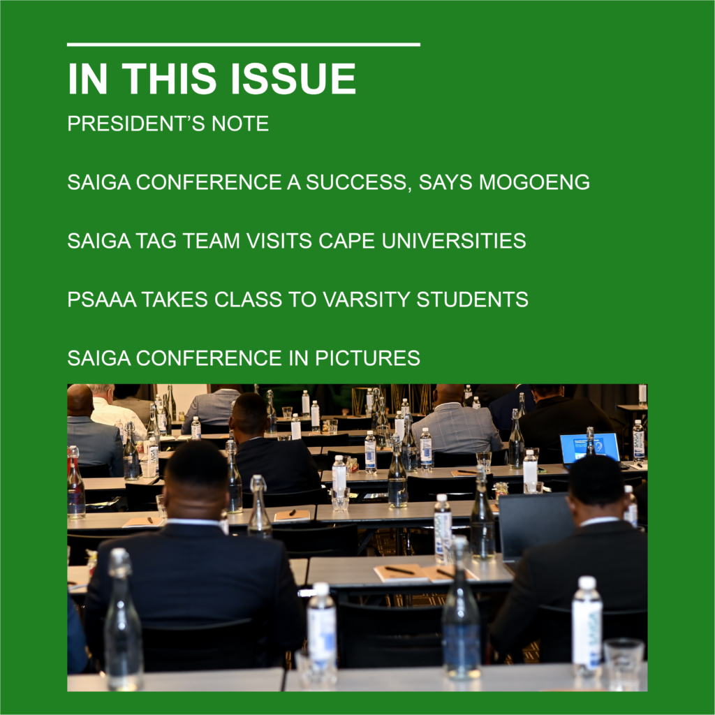 View the updated SAIGA logo, and also check out what the SAIGA members, stakeholders and sponsors got up to at the Annual Conference in Pretoria. Enjoy the latest edition.